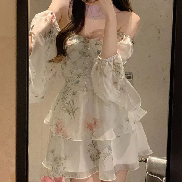 Chiffon Dress for Women Long Sleeve Party French Style Dress Fairycore Floral Ruffles Square Collar New Spring Summer Dress